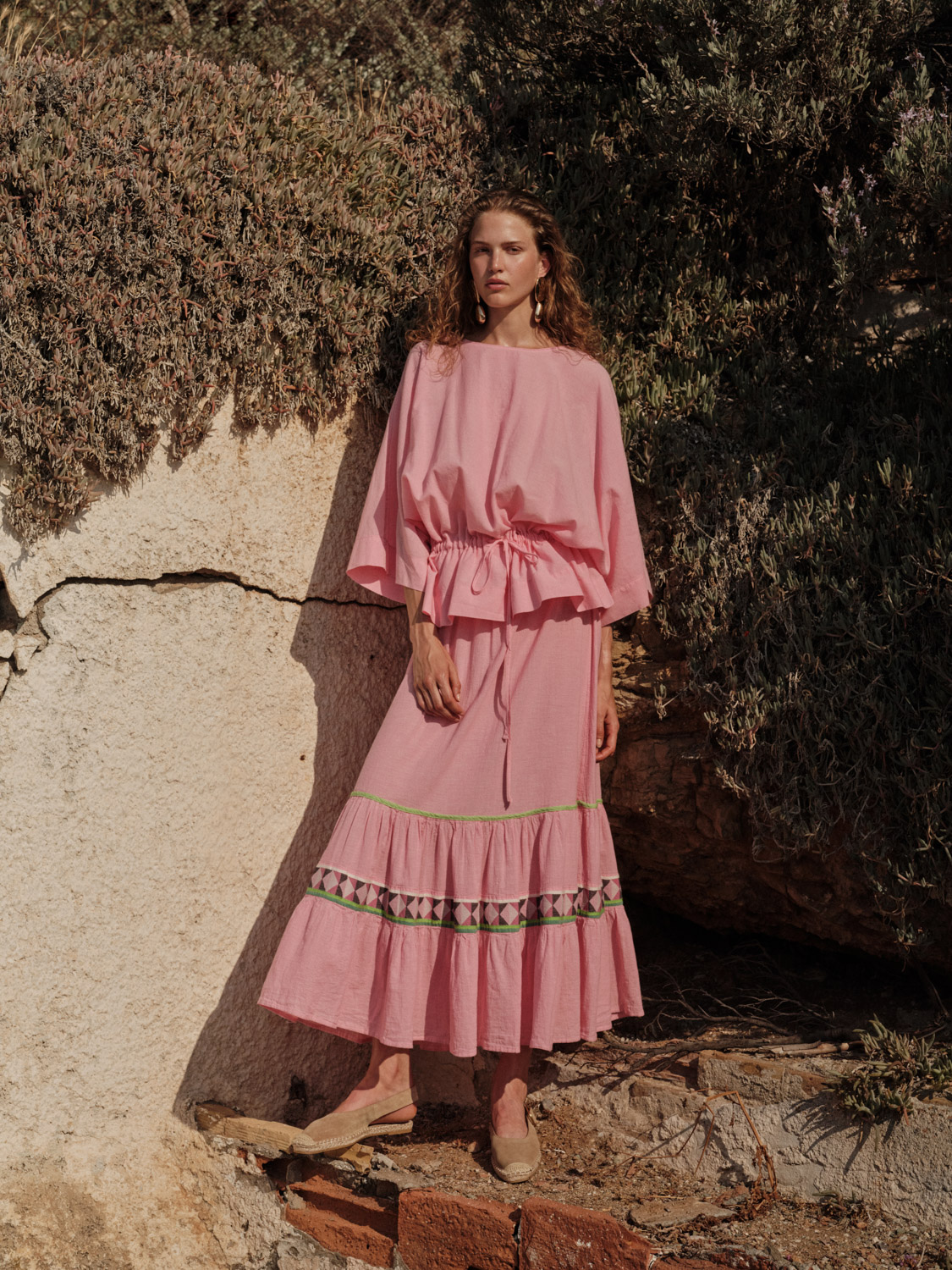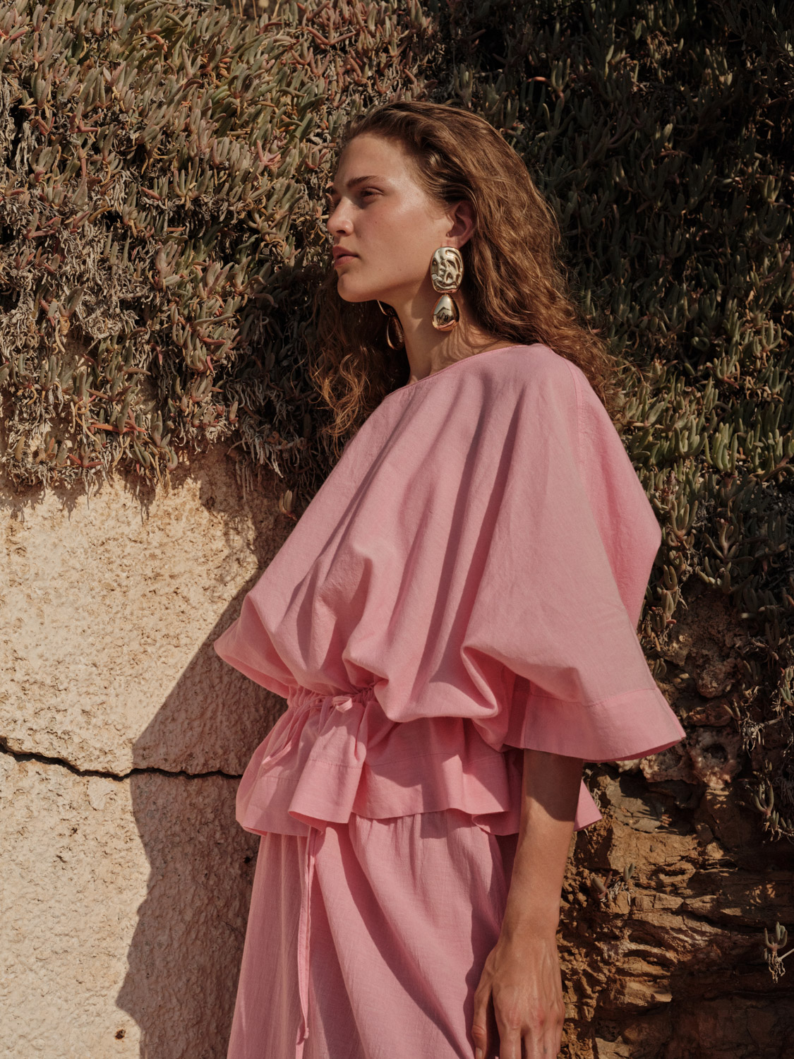 Ελαφριά βαμβακερή μπλούζα με φαρδιά μανίκια και ρυθμιζόμενη μέση με κορδόνι.