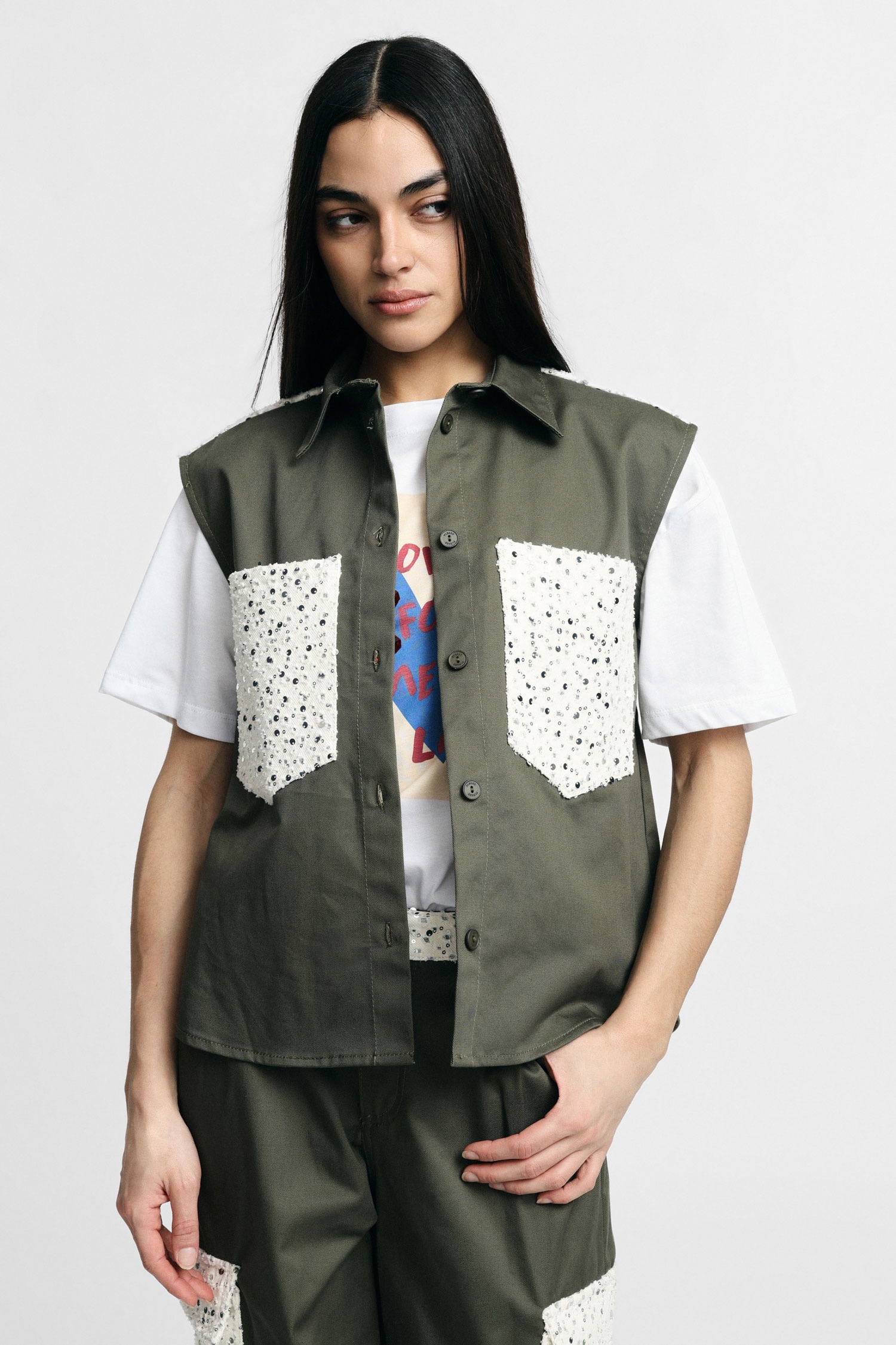 Αυτό το αμάνικο εξωτερικό μπουφάν συνδυάζει τις τσέπες με κέντημα και την ίσια γραμμή για μια δημιουργική ατμόσφαιρα πόλης. Διαθέτει πρακτικό κλείσιμο με κουμπιά μπροστά και λεπτομέρειες σε αντίθεση στους ώμους, καθιστώντας το ιδανικό για να προσθέσετε χαρακτήρα σε καθημερινά σύνολα. Ιδανικό για πειράματα στυλ και φρέσκους συνδυασμούς.